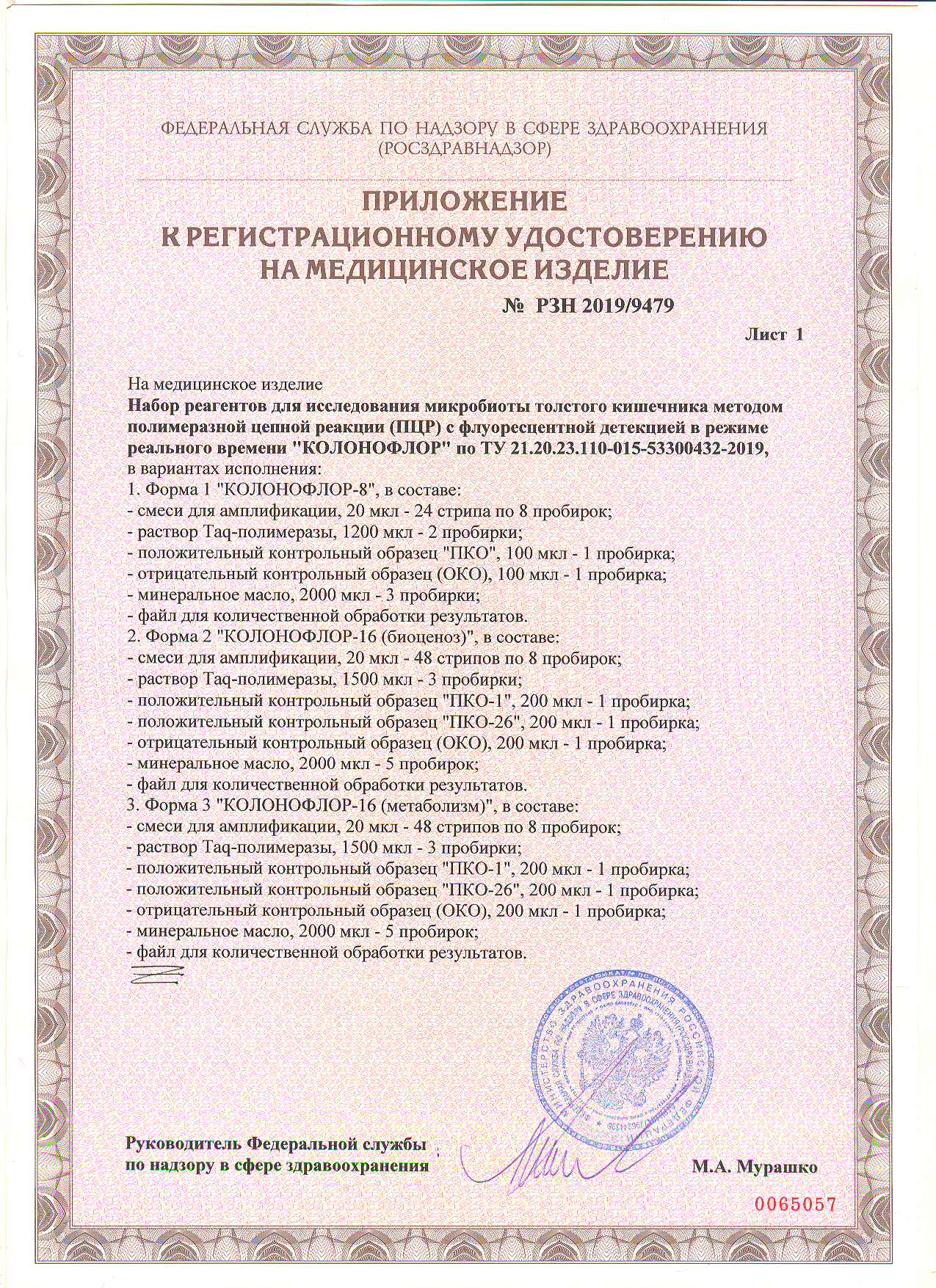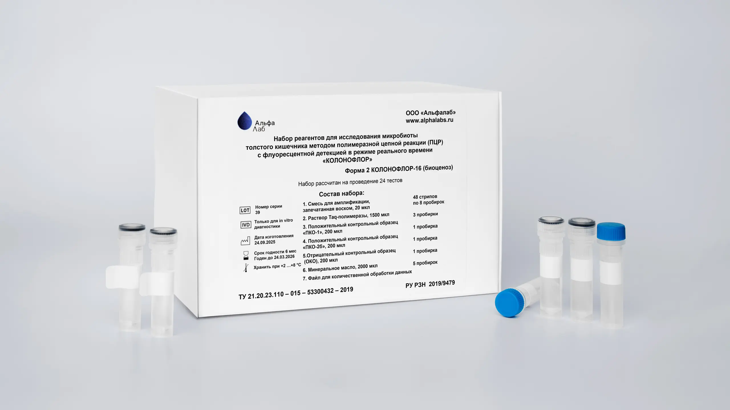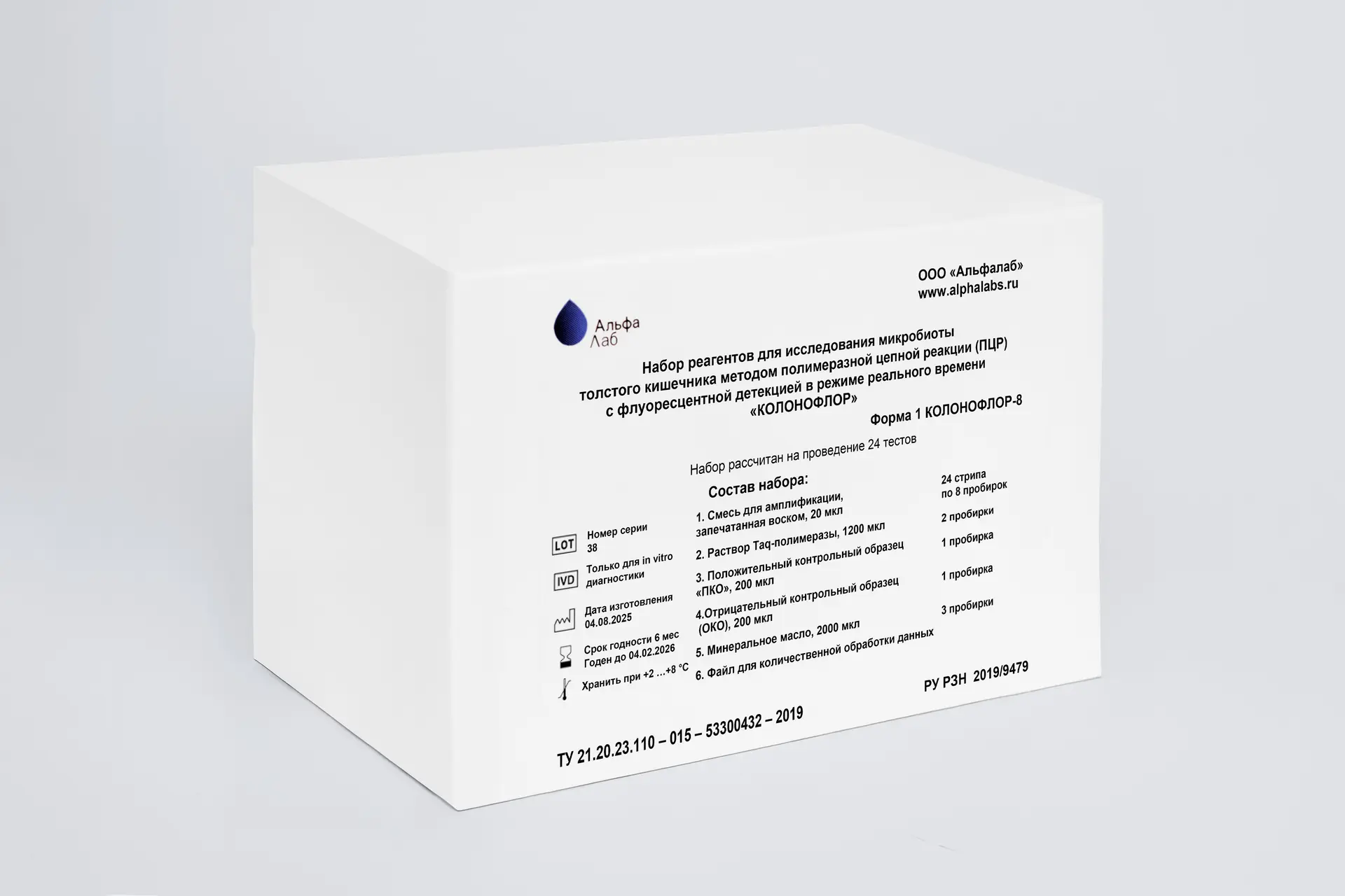 The reagent kit "COLONOFLOR" is intended for quantitative assessment of the state of the microbiocenosis of the large intestine in children and adults using the polymerase chain reaction (PCR) method with fluorescent detection of amplification results in real time.