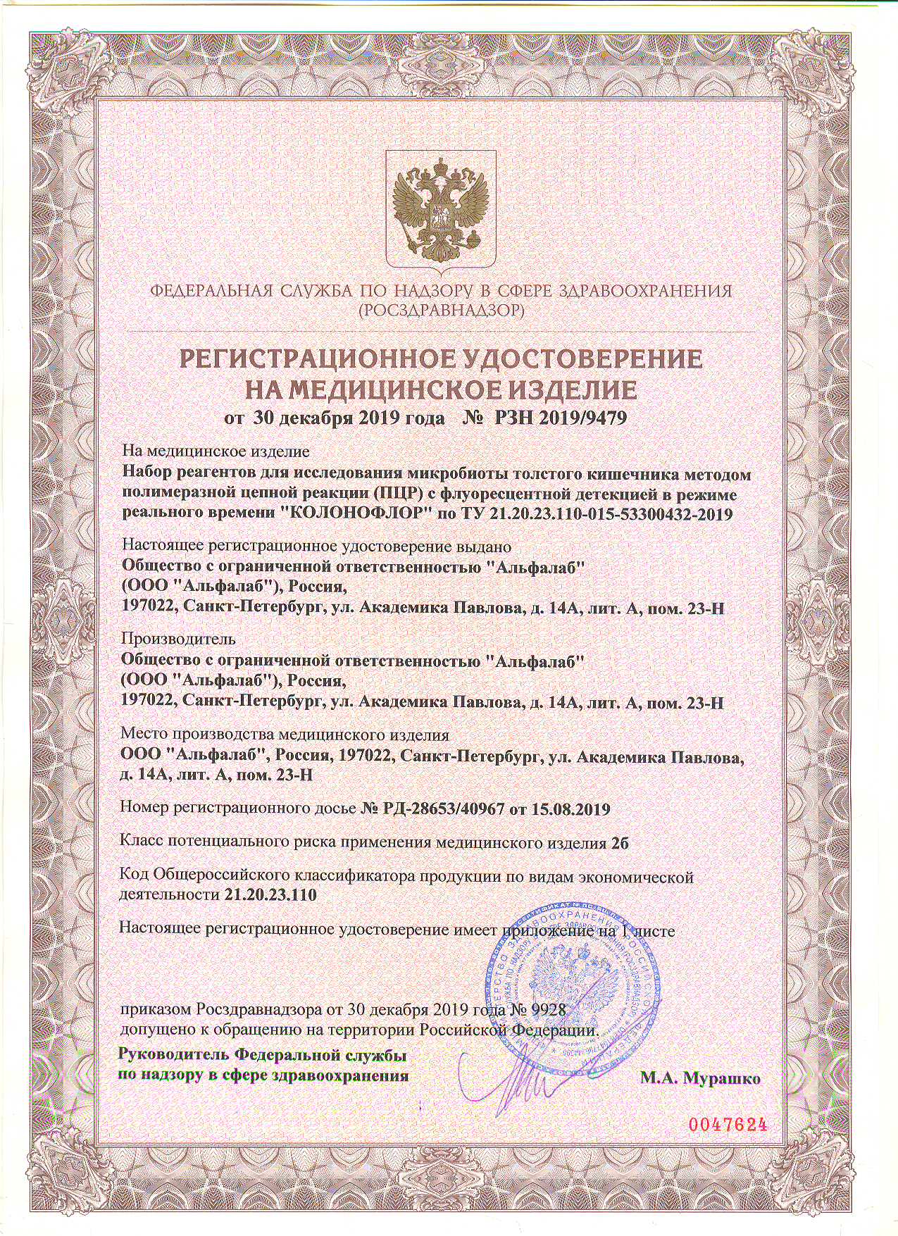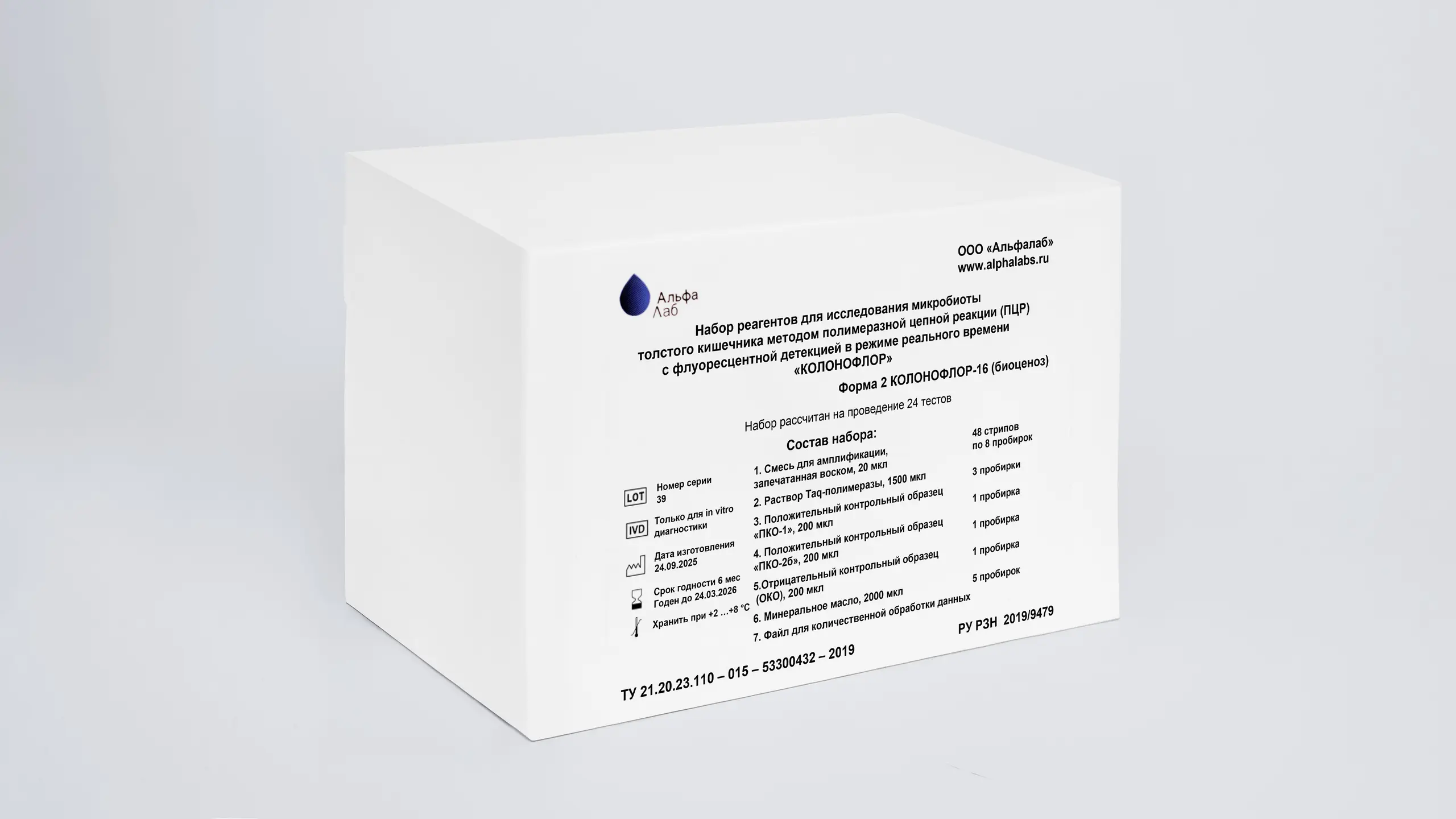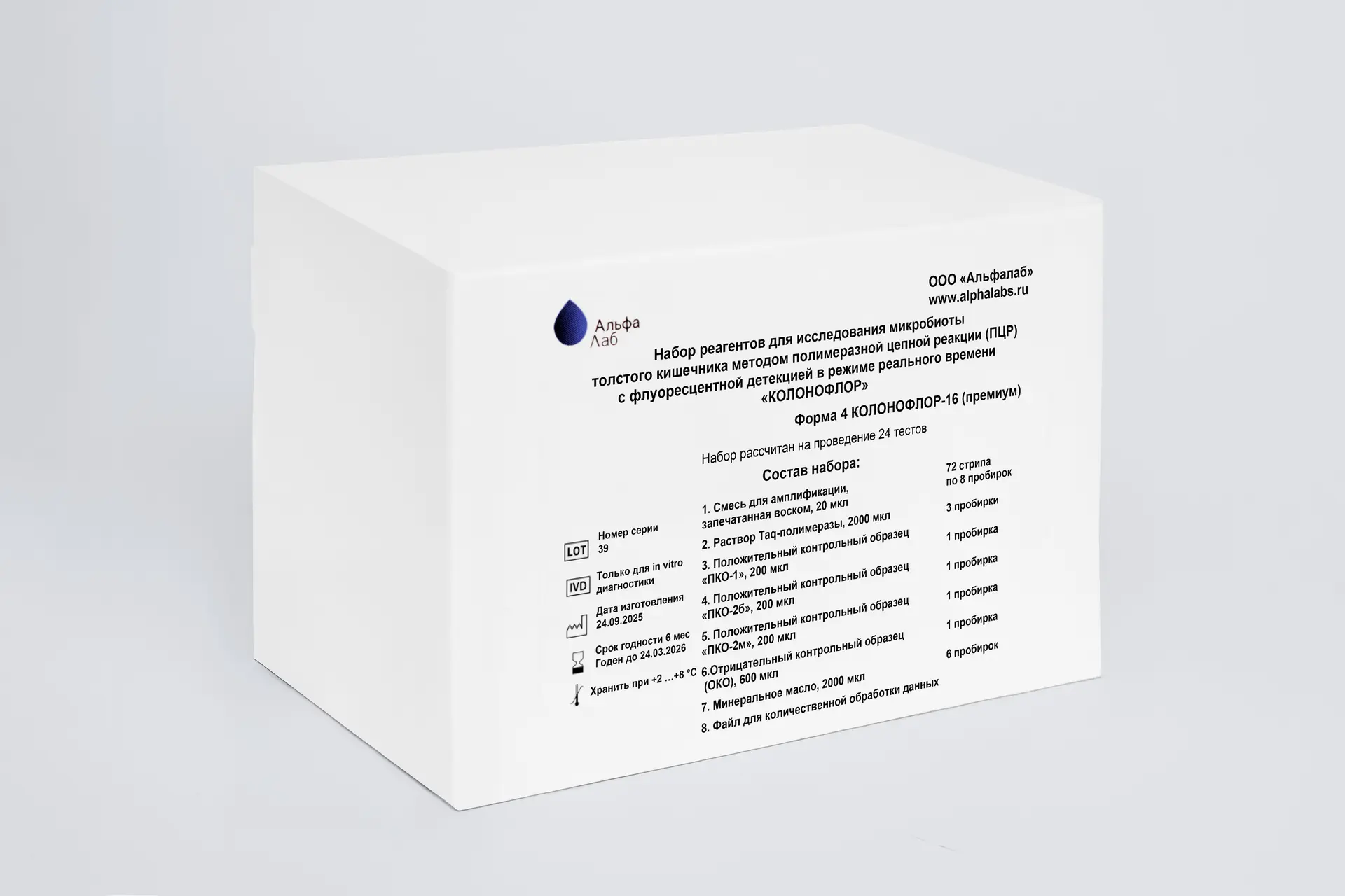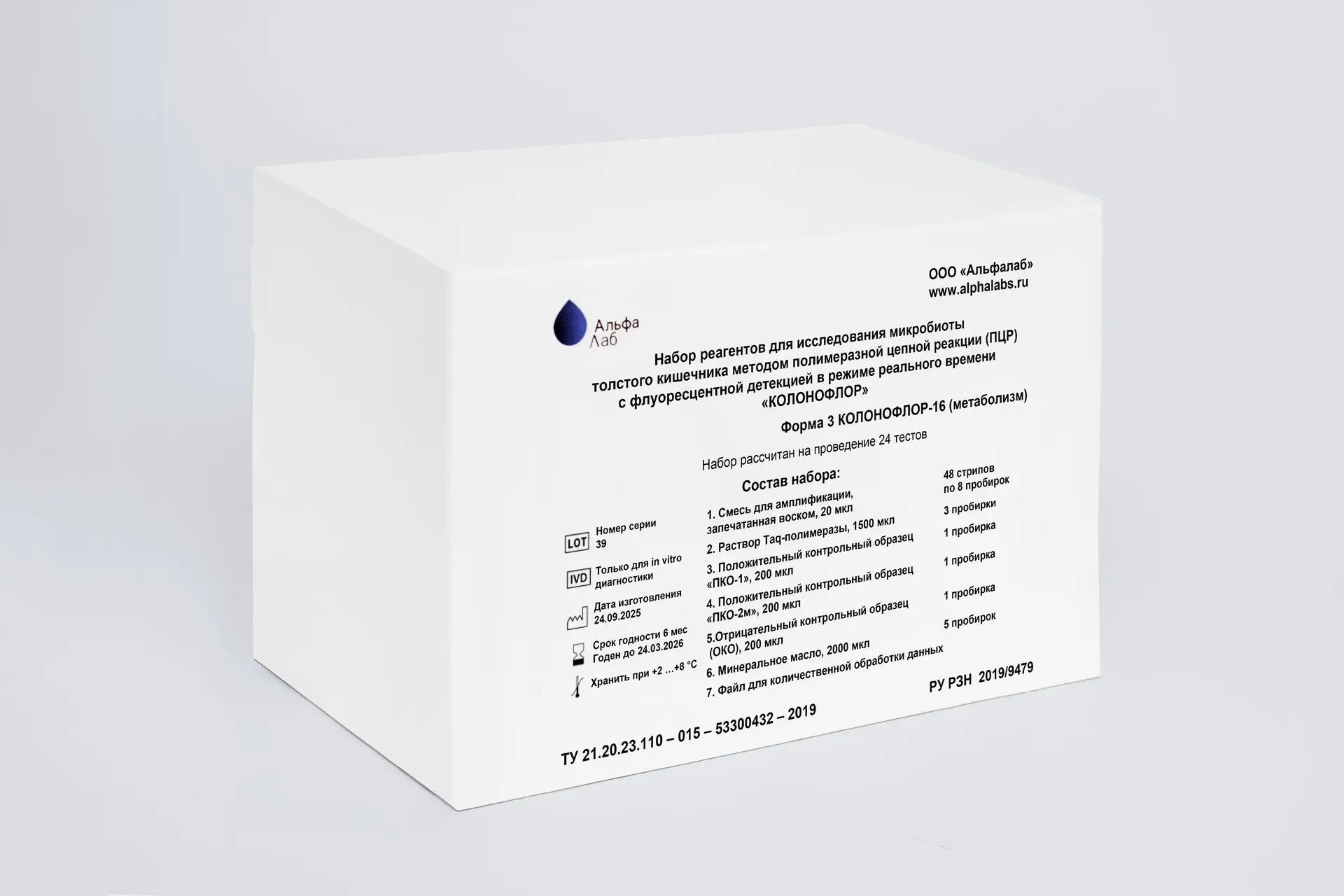 The reagent kit "COLONOFLOR" is intended for quantitative assessment of the state of the microbiocenosis of the large intestine in children and adults using the polymerase chain reaction (PCR) method with fluorescent detection of amplification results in real time.