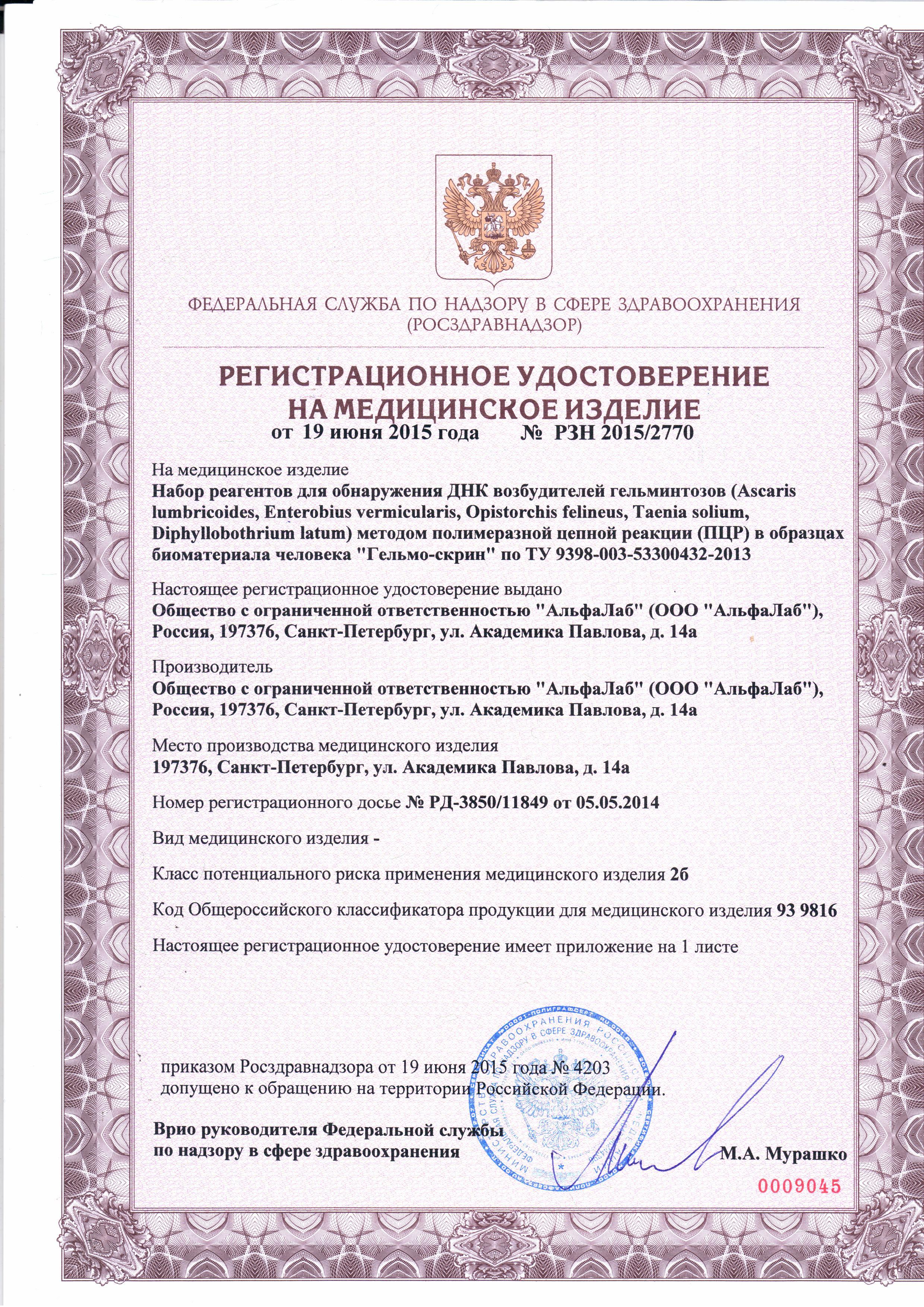 Certificate № | РЗН 2015/2770 |