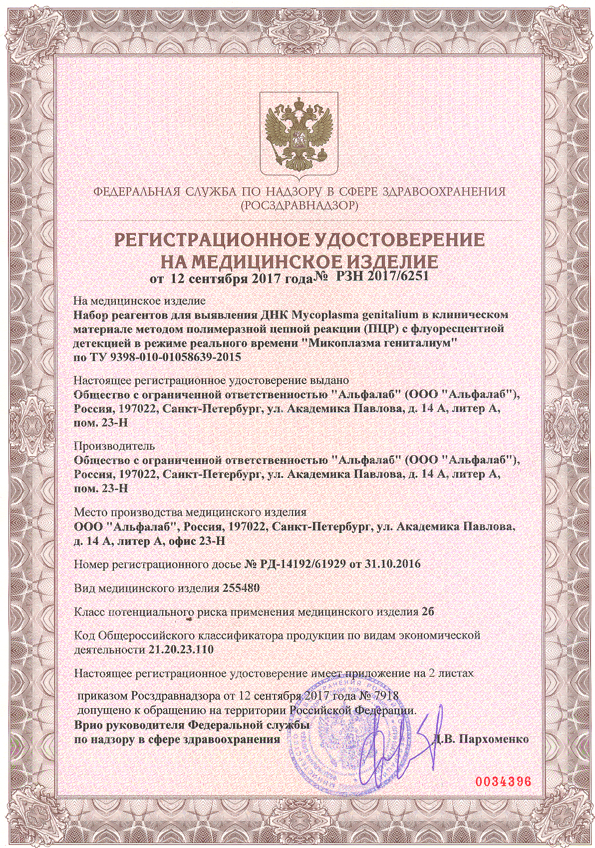 Certificate № | РЗН 2017/6251 |